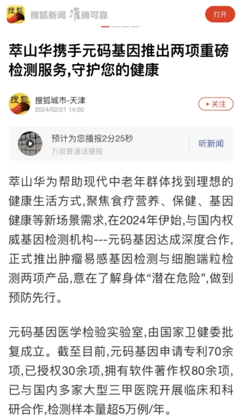 췌이산화는 현대 중장년층이 건강한 생활 방식을 찾을 수 있도록 식이 요법, 건강 관리, 유전자 건강 등의 새로운 요구에 중점을 두고 있습니다. 2024년 초, 췌이산화는 국내 권위 있는 유전자 검사 기관인 원마 유전자(元码基因)와 깊은 협력을 맺고 종양 취약 유전자 검사와 세포 텔로미어 검사라는 두 가지 검사 서비스를 공식 출시했습니다. 이를 통해 사람들은 자신의 몸 속 "잠재적 위험"을 미리 파악하고 예방할 수 있게 되었습니다.