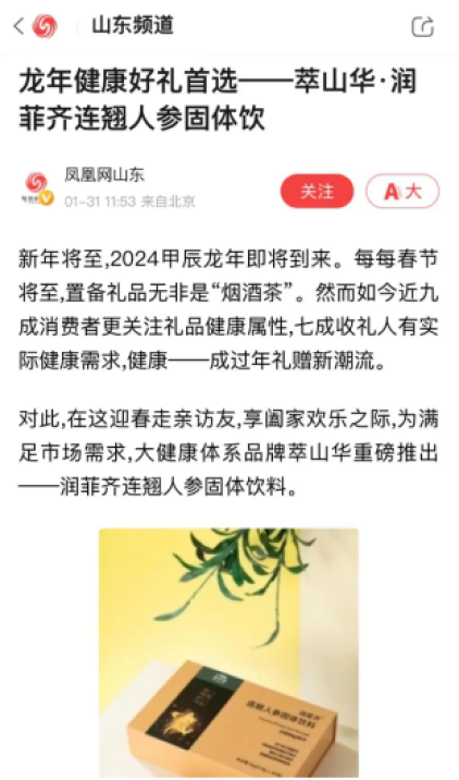 이에 따라 췌이산화는 새해를 맞아 가족 및 친지들과의 즐거운 시간 속에서 건강을 챙기고자 하는 시장의 요구를 충족시키기 위해 룬페이치(润菲齐) 연교 인삼 고체 음료를 중점적으로 출시했습니다